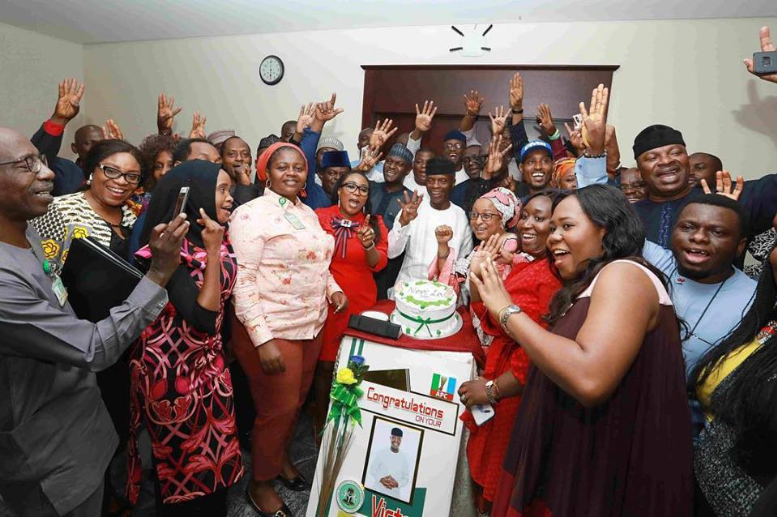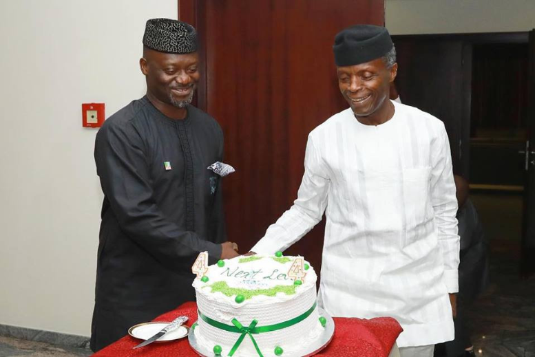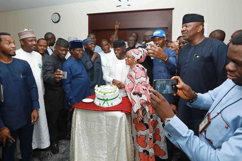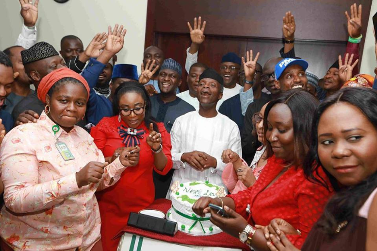 Early this morning, Vice President Yemi Osinbajo celebrated himself and President Buhari’s victory in the 2019 presidential election which held last Saturday, with members of his staff in the presidential villa.