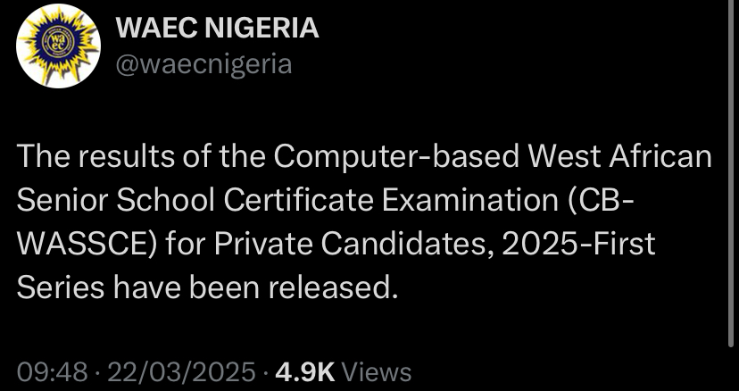 The examination body made this known in a post shared on its official X (formerly Twitter) handle on Saturday, March 22, 2025.