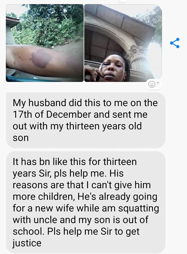 According to the story shared yesterday by human rights lawyer Emeka Ugwuonye,a lady was beaten mercilessly by his wife for inability to give him more children.He also sent her out of the house.