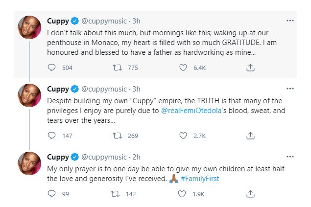 “Despite building my own “Cuppy” empire, the TRUTH is that many of the privileges I enjoy are purely due to @realFemiOtedola’s blood, sweat, and tears over the years…