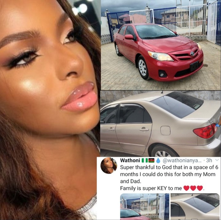 Big Brother Naija star, Wathoni Anyasi has stated via her Twitter handle that she bought a car each for her mother and father in a space of 6 months, IgbereTV reports.