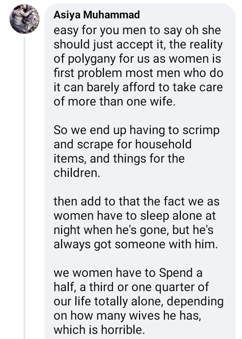 “Easy for you men to say, oh she should just accept it. The reality of polygamy for us as women is first problem most men who do it can barely afford to take care of more than one wife. So we end up having to scrimp and scrape for household items, and things for the children,” she wrote.