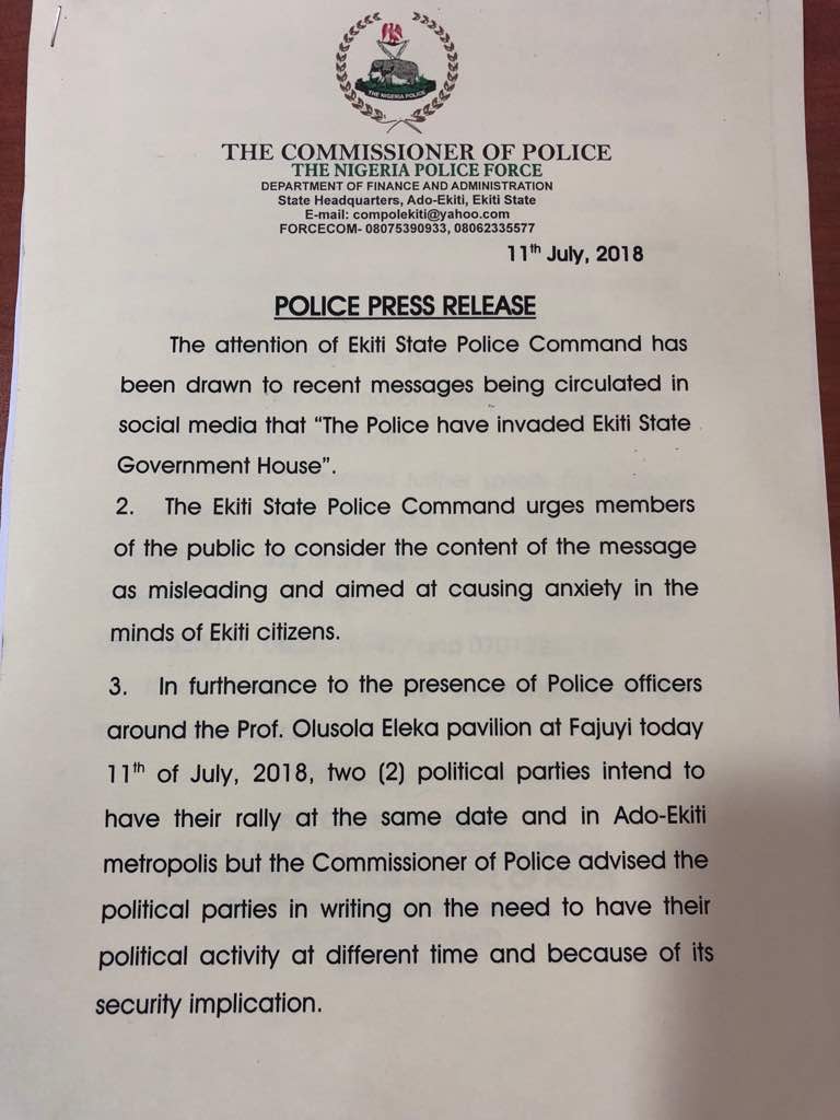 “Disregard Olayinka Lere and Governor Ayo Fayose rumours that we invaded the government house, it’s far from Truth”- Police.