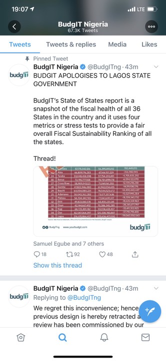 The accurate information that ought to have been stated in the table published by BudgITng is provided as extracted from Lagos State’s published 2019 Audited Financial Statements: As indicated in Lagos State’s published Financial Statements the information in the table published by BudgITng should have correctly indicated a surplus of N89 billion (Eighty-Nine Billion Naira).