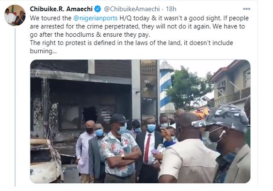 We Have To Go After The Hoodlums And Ensure They Pay” – Rotimi Amaechi Reacts After Visiting Burnt NPA Headquarters