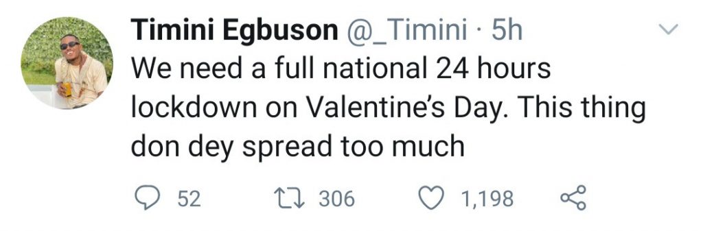 He tweeted: “We need a full national 24 hours lockdown on Valentine’s Day. This thing don dey spread too much.”