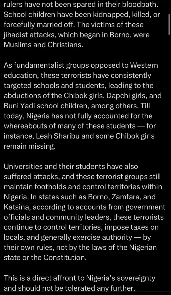 “I wish to state, firstly, that Nigeria’s sovereignty, territorial integrity, and national institutions must be respected by all. At the same time, I fully support any collaborative action aimed at eradicating the murderous bands of terrorists who have wantonly slaughtered thousands of our countrymen and women — Christians, Muslims, and people of other faiths alike.
