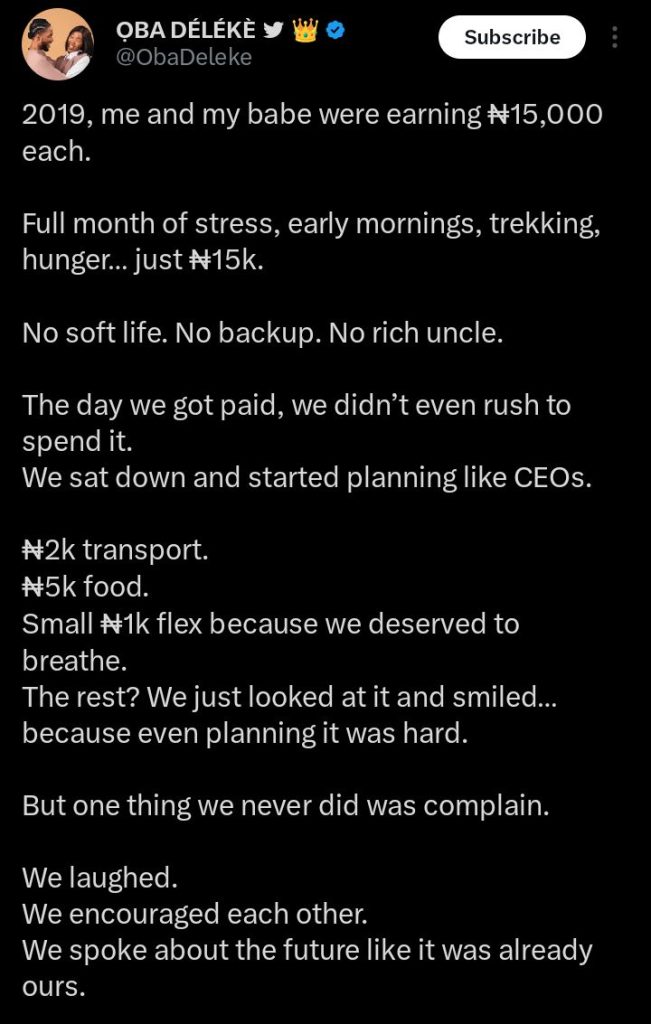 We never complained about what we didn’t have. We laughed, encouraged each other, and spoke about the future like it was already ours. That phase taught us that it’s not just about money, but mindset and who you’re building with. If you can stay hopeful with ₦15k, you’ll be unstoppable when real money comes,” the post added.