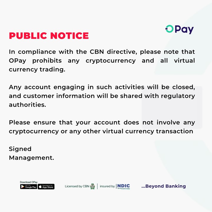 In compliance with the CBN directive, please note that OPay prohibits any cryptocurrency and all virtual currency trading.