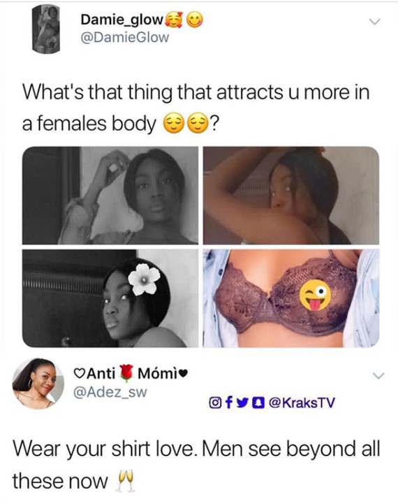 See this funny reply this lady gave another lady who asked guys what they like in a lady’s body. She asked this question without her shirt on.