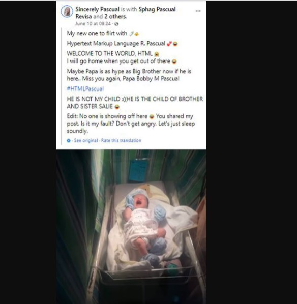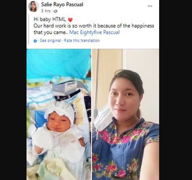 In a Facebook post, the newborn was introduced as Hypertext Mark-up Language Rayo Pascual – or HTML for short