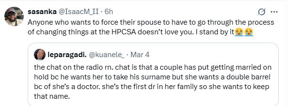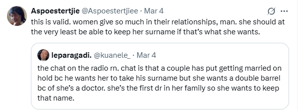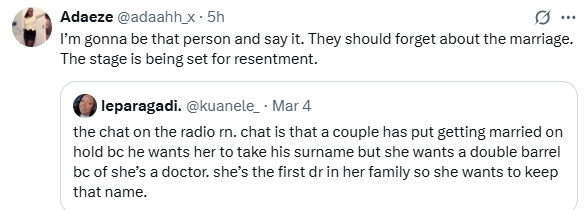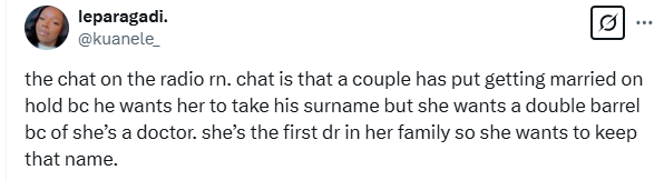 “The chat on the radio rn. Chat is that a couple has put getting married on hold bc he wants her to take his surname but she wants a double barrel bc of she’s a doctor. She’s the first dr in her family so she wants to keep that name,” she wrote.