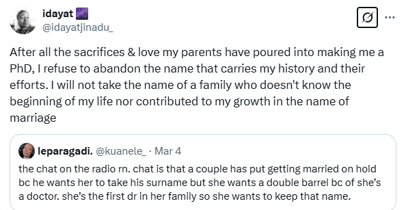 A PhD student, Idayat Jinadu wrote: “After all the sacrifices & love my parents have poured into making me a PhD, I refuse to abandon the name that carries my history and their efforts. I will not take the name of a family who doesn’t know the beginning of my life nor contributed to my growth in the name of marriage.”