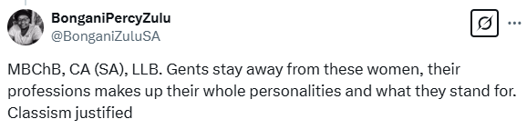 One Bongani wrote: “MBChB, CA (SA), LLB. Gents stay away from these women, their professions make up their whole personalities and what they stand for. Classism justified.”