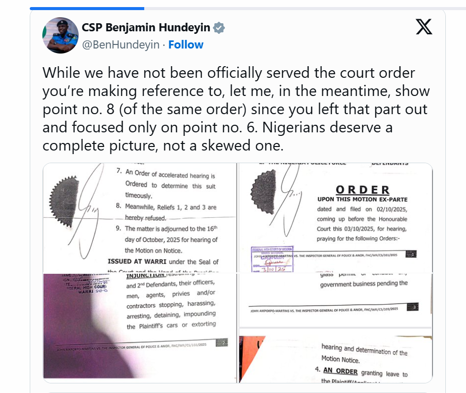 Human rights lawyer Inibehe Effiong had earlier shared on X that the Warri court ordered the police to halt enforcement, but Hundeyin noted the plaintiff’s three main injunctions were refused. He cited section eight of the order, which instructs all parties to preserve the status quo pending the October 16 hearing, accusing critics of presenting a “skewed picture.”