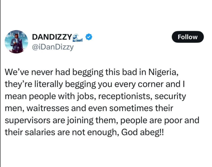“We’ve never had begging this bad in Nigeria,” the post reads. “They’re literally begging you every corner and I mean people with jobs… People are poor and their salaries are not enough. God abeg!!”