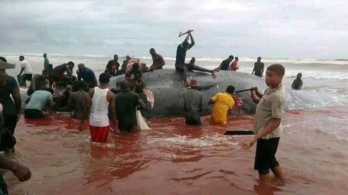 Earlier today a Nigerian lady posted a video of a big whale that was caught and butchered in Bayelsa State, Nigeria. We also sighted another video of 5 whales caught in Florida, USA.Now, there is very huge difference between the whales caught in the two countries. The one in Nigeria was washed ashore and before you knew it, residents in the community had attacked it and butchered it in preparation for some delicious meal tonight.Later this evening, just like a coincidental event, some whales were washed ashore in Florida and they happened to be stranded along the beach.Well, you wouldn’t expect them to act as my fellow Balyesans, these whales were helped back into the sea to continue their seaing adventure.