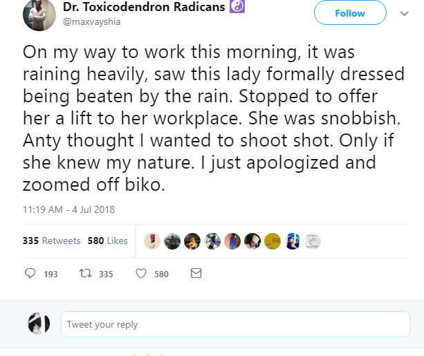 An Ibadan based man has revealed on his page how a lady snubbed him while he tryna picking her up with his car, even though she was soaked in the rain..According to him he was just trying to be a gentleman, but she beefed him, and he zoomed off…Maybe she was been cautious tho.