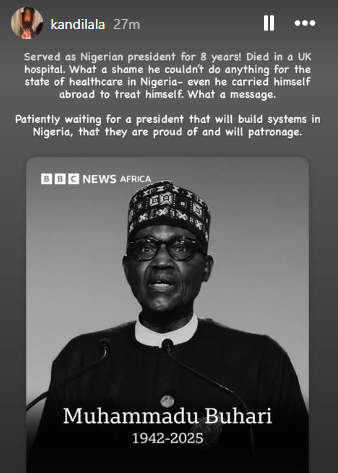 In a post on her Instagram story on Monday, July 14, Kandibe said the late ex-President’s decision to seek care abroad sends the wrong message about the state of healthcare in Nigeria.