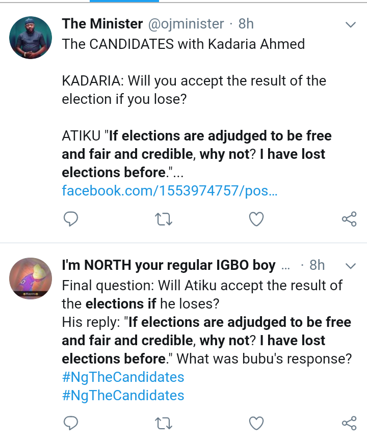 As the very final question before drawing the curtain on the interaction, Atiku was asked if he would accept the result of the election should he lose.