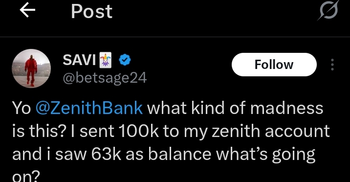 Yo @ZenithBank, what kind of madness is this? I sent ₦100k to my Zenith account and saw ₦63k as balance. What’s going on?”.