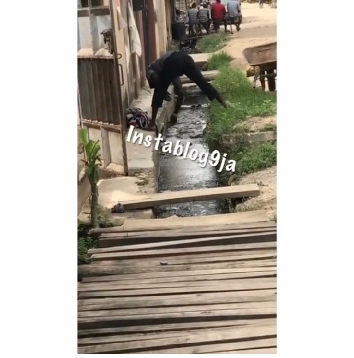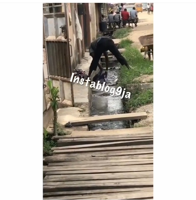 Wheelbarrow Pusher Spotted Washing His Clothes Inside A Gutter In Ketu, Lagos
