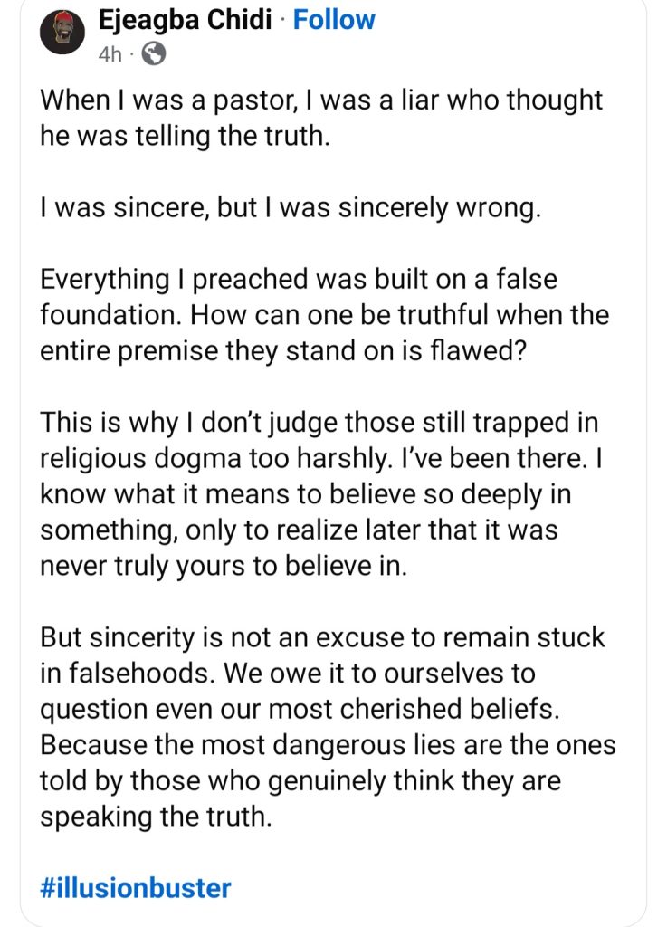 Ejeagba Chidi claimed that he was a liar as a pastor but thought he was telling the truth because he believed in his message.