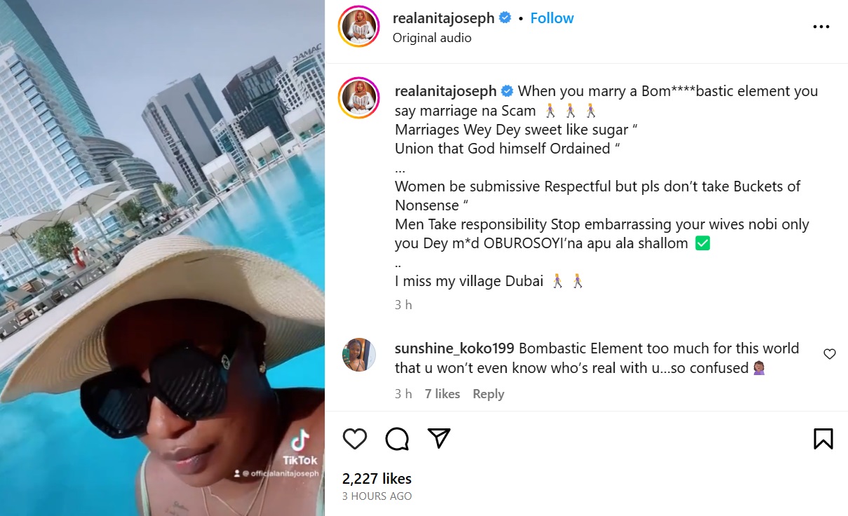 “Women be submissive Respectful but pls don’t take Buckets of Nonsense. Men Take responsibility Stop embarrassing your wives nobi only you Dey m*d OBUROSOYI’na apu ala shallom. I miss my village Dubai”