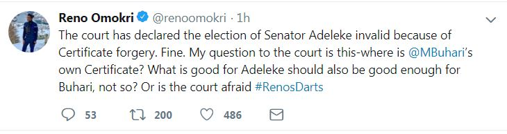 “Where Is Buhari’s Certificate” – Reno Omokri Reacts To Adeleke’s Certificate Forgery