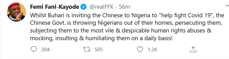 “Whilst Buhari is inviting the Chinese to Nigeria to “help fight Covid 19”, the Chinese Govt. is throwing Nigerians out of their homes, persecuting them, subjecting them to the most vile & despicable human rights abuses & mocking, insulting & humiliating them on a daily basis!’.’