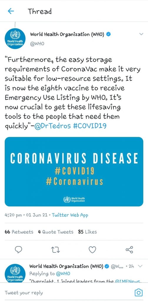 “Today, I’m happy to announce that the Sinovac-CoronaVac vaccine has been given WHO Emergency Use Listing after being found to be safe, effective and quality assured following two doses of the inactivated vaccine”-@DrTedros #COVID19