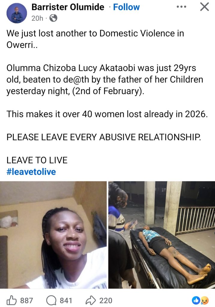 Olumma Chizoba Lucy Akataobi, lost her life allegedly due to domestic violence around 11pm on Monday, February. 2.