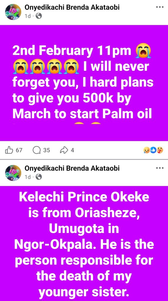She said her sister’s husband Kelechi Prince Okeke, a drug seller, k!lled her sister because she asked him for the N35,000 that her customer paid into his account.