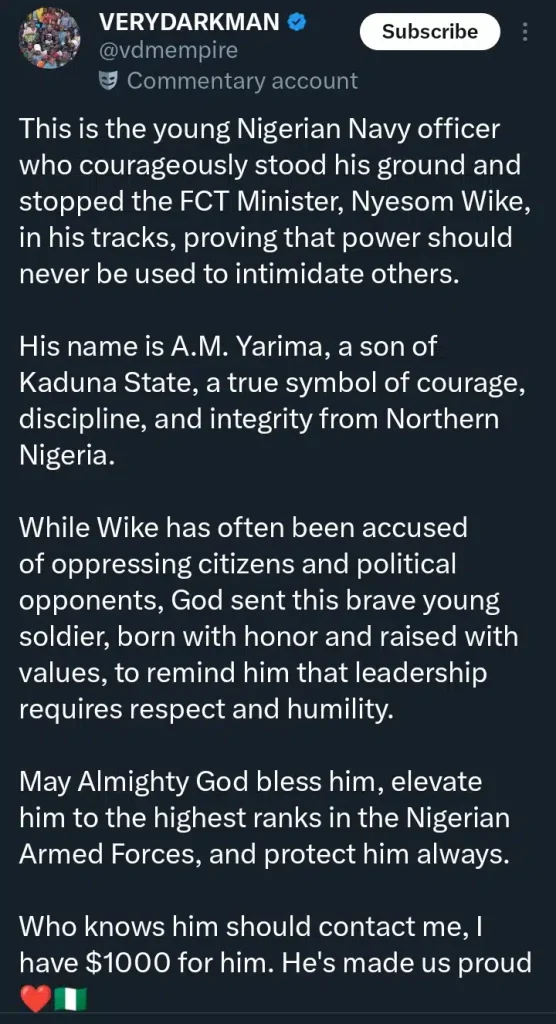He wrote: “This is the young Nigerian Navy officer who courageously stood his ground and stopped the FCT Minister, Nyesom Wike, in his tracks, proving that power should never be used to intimidate others.”