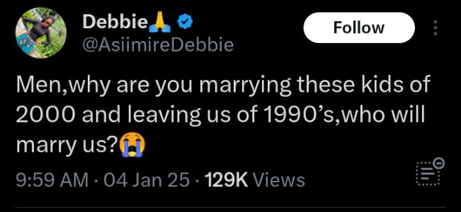 The lady, Debbie, in a tweet via her page on X, formerly known as Twitter, yearned to know the reason men prefer to go for the ladies born in the 2000s when they want to settle, and leave people of her kind who were born in the 1990s.