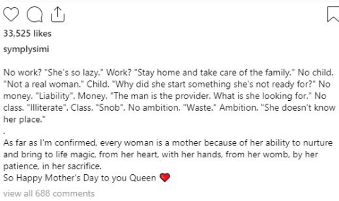 She wrote: “No work? “She’s so lazy.” Work? “Stay home and take care of the family.” No child. “Not a real woman.” Child. “Why did she start something she’s not ready for?” No money. “Liability”. Money. “The man is the provider. What is she looking for.” No class. “Illiterate”. Class. “Snob”. No ambition. “Waste.” Ambition. “She doesn’t know her place.”“As far as I’m confirmed, every woman is a mother because of her ability to nurture and bring to life magic, from her heart, with her hands, from her womb, by her patience, in her sacrifice. “So Happy Mother’s Day to you Queen “