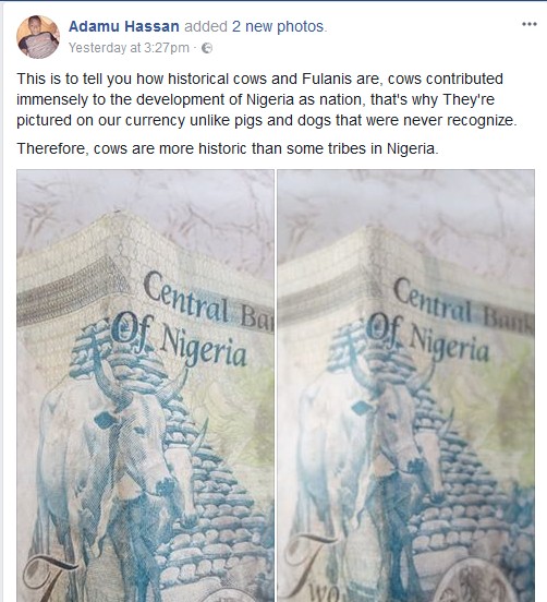A young man from Abbare area of Taraba state, has got himself trending on Facebook after coming to the defence of the Fulani sect which has been trailed with series of bad news. The young Fulani man identified as Adamu Hassan shared a picture of 200 naira note – showing the area where cows are drawn as he claimed that cows are more historic than some tribes in Nigeria.
