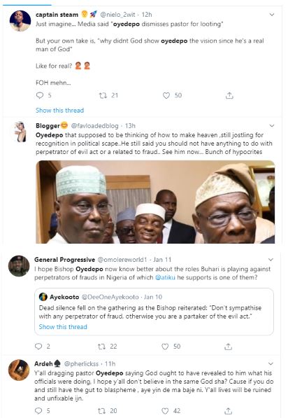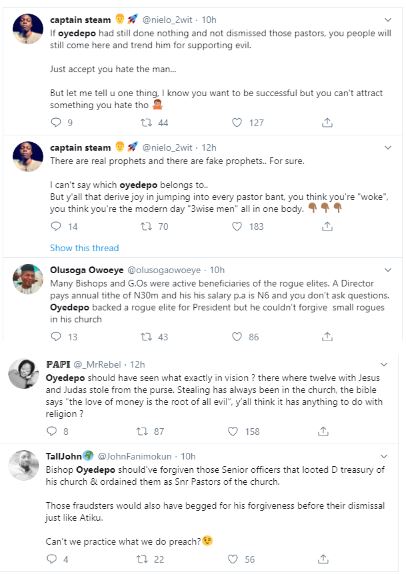 Some Nigerians have reacted after Founder and General Overseer of the Living Faith Church a.k.a Winners Chapel, Bishop David Oyedepo dismissed his senior church officials for Looting the church’s treasury.