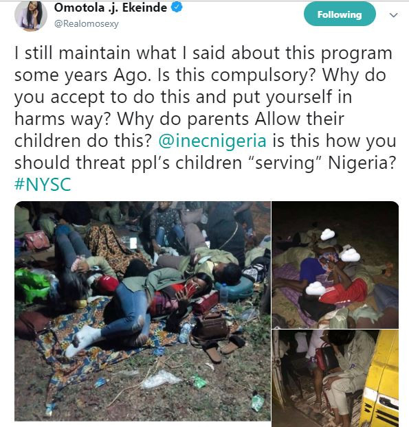 According to her, ‘I still maintain what I said about this program some years Ago. Is this compulsory? Why do you accept to do this and put yourself in harms way? Why do parents Allow their children do this? INEC is this how you should threat ppl’s children “serving” Nigeria? #NYSC’.