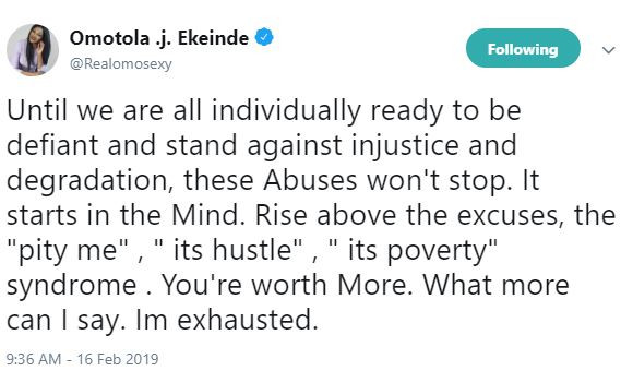 She added that, ‘until we are all individually ready to be defiant and stand against injustice and degradation, these Abuses won’t stop. It starts in the Mind. Rise above the excuses, the “pity me” , ” its hustle” , ” its poverty” syndrome . You’re worth More. What more can I say. Im exhausted’.