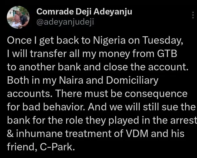 Furthermore, Deji Adeyanju stated that upon his return to Nigeria, he will transfer all his funds from GTBank and close the account, emphasizing that actions have consequences.