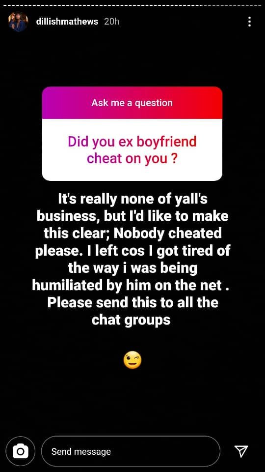 Responding, Dillish said none of them cheated, revealing that she left the relationship because she got tired of being humiliated by the footballer on the internet.