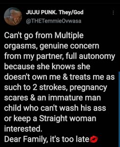 “Can’t go from multiple orgasms, genuine concern from my partner, full autonomy because she knows she doesn’t own me and treats me as such to 2 strokes, pregnancy scares and an immature man child who can’t wash his ass or keep a straight woman interested. Dear family, it’s too late,” she said in parts.