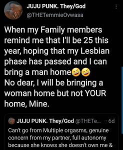 Nigerian queer singer Temmie Ovwasa popularly known as YBNL Princess has revealed why it’s too late to change her sexual orientation, saying that lesbianism is not a phase and that developing interest in a heterosexual male is downgrading.