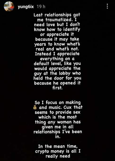 Nigerian rapper, Yung6ix has talked about why he focuses on making money rather than on love.