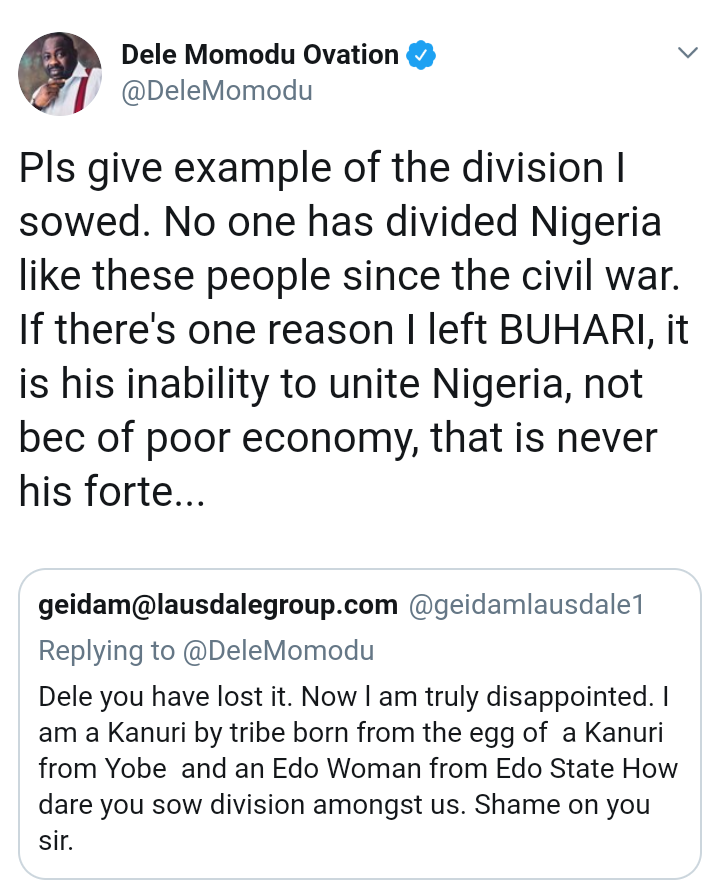 The follower wrote: “Dele you have lost it. Now l am truly disappointed. I am a Kanuri by tribe born from the egg of a Kanuri from Yobe and an Edo Woman from Edo State How dare you sow division amongst us? Shame on you sir.