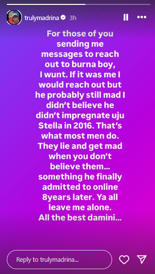 “For those of you sending me messages to reach out to burna boy, I wunt. If it was me I would reach out but he probably still mad I didn’t believe he didn’t impregnate uju