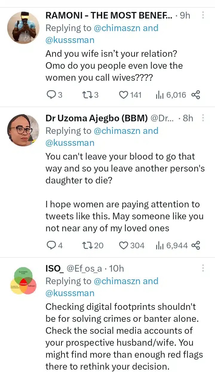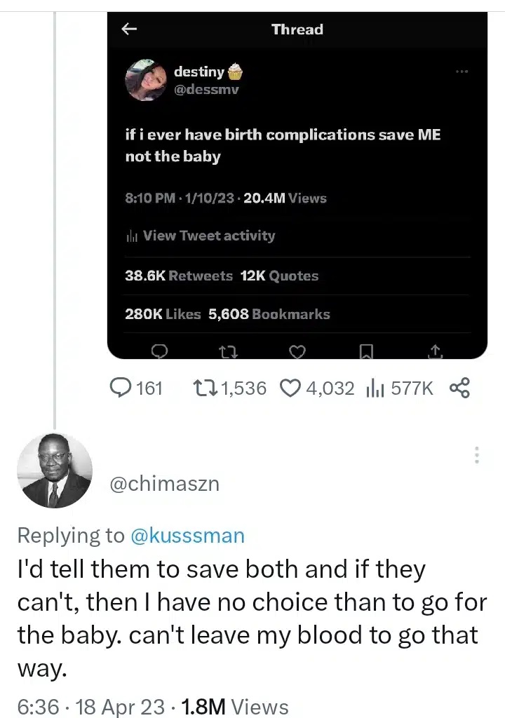 The Twitter user with the handle, @Chimaszn said if he’s found in the situation to save his wife or baby during childbirth complication, he will choose his baby.