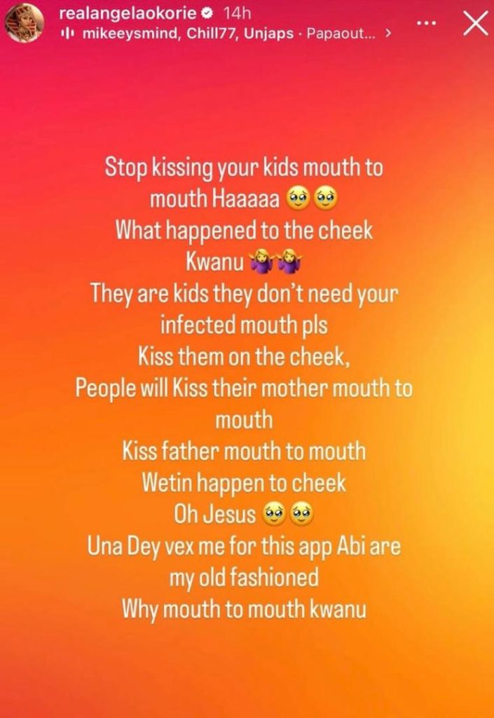Nollywood actress, Angela Okorie has raised eyebrows online with her strong advice to parents about kissing their children.