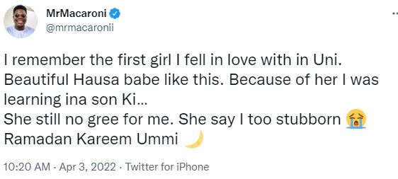 He wrote, “I remember the first girl I fell in love with in University. Beautiful Hausa babe like this. Because of her I was learning ina son Ki… She still no gree for me. She say I too stubborn